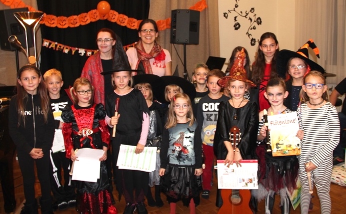 In stimmungsvoll, gruseligen Kostümen präsentierten Schülerinnen und Schüler von Christina Cernek und Anita Vockner eine schaurig schöne Klanggeschichte mit Instrumentalstücken Liedern und coolen Klängen und Rhythmen. Eine rundum gelungene musikalische Halloweenfeier!
